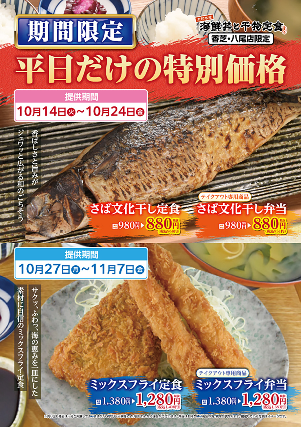 平日&期間限定の特別価格! 海鮮丼と干物定食専門店 香芝店・八尾店にて