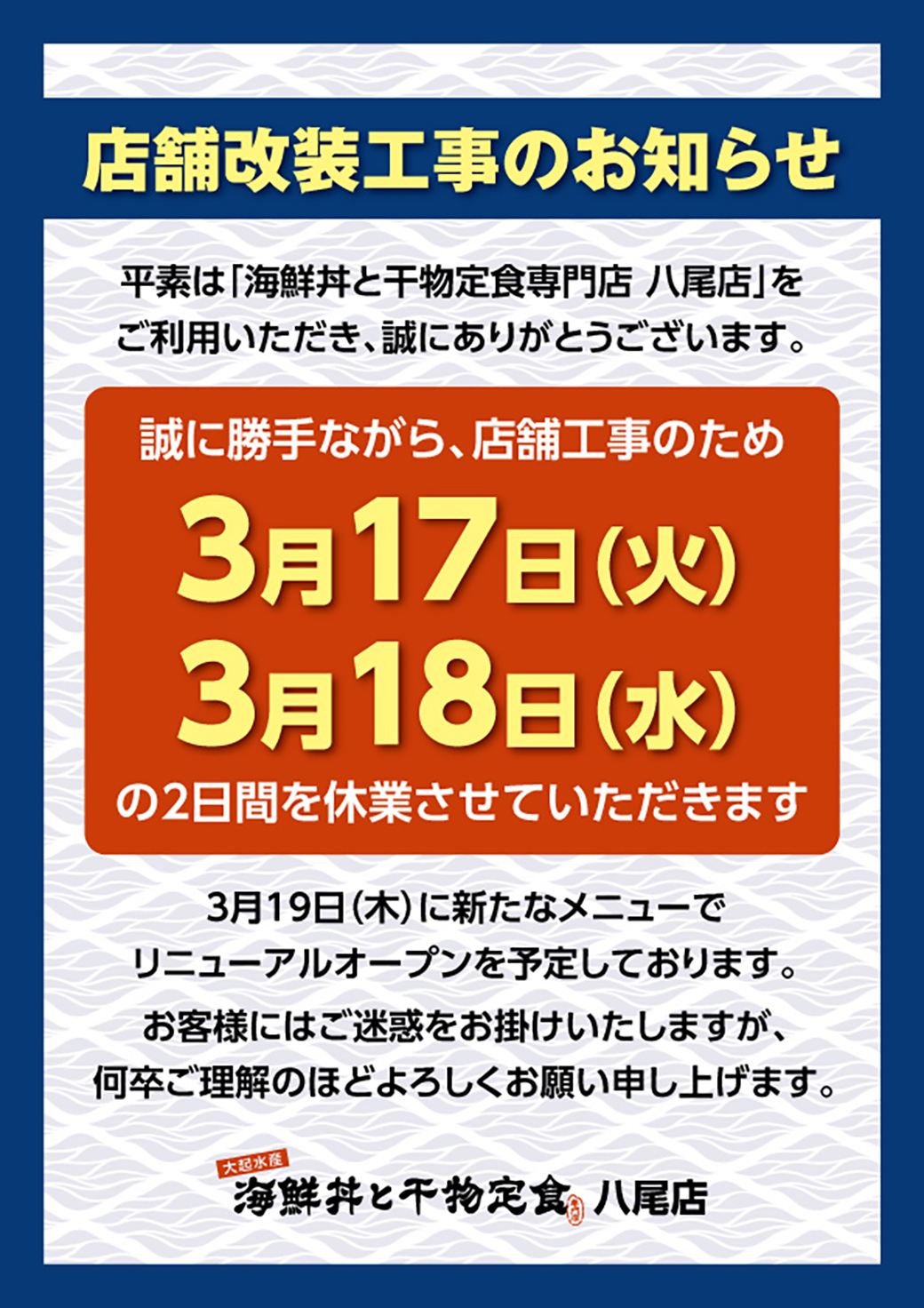 【3月17日(火)・18日(水)】「海鮮丼と干物定食専門店 八尾店」 店舗改装工事のお知らせ